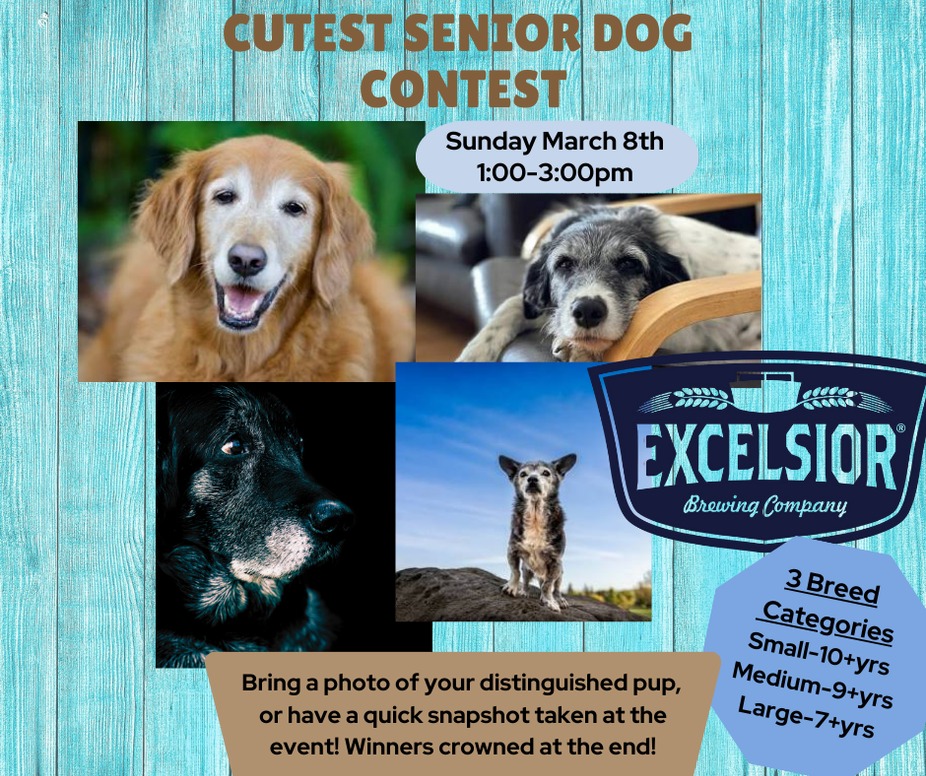 2nd Annual Cutest Senior Dog Contest at Excelsior Brewing Co.! Mark your calendars for Sunday, March 8th from 1–3 PM and celebrate our senior pups in style! 🐾