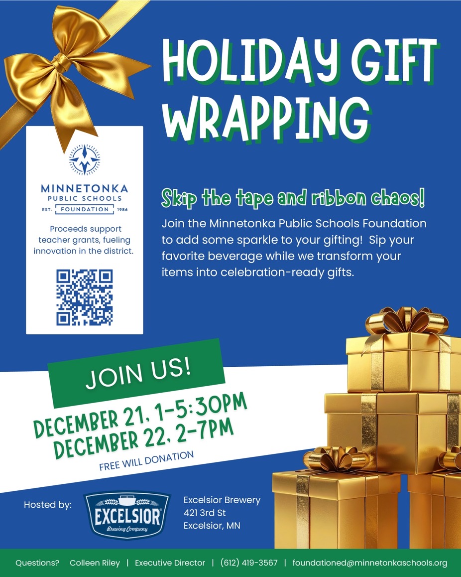 Bring your holiday gifts to Excelsior Brewing Company and let the Minnetonka Public Schools Foundation handle the wrapping. Enjoy a beer while you wait as their team of festive volunteers wraps your presents with care.